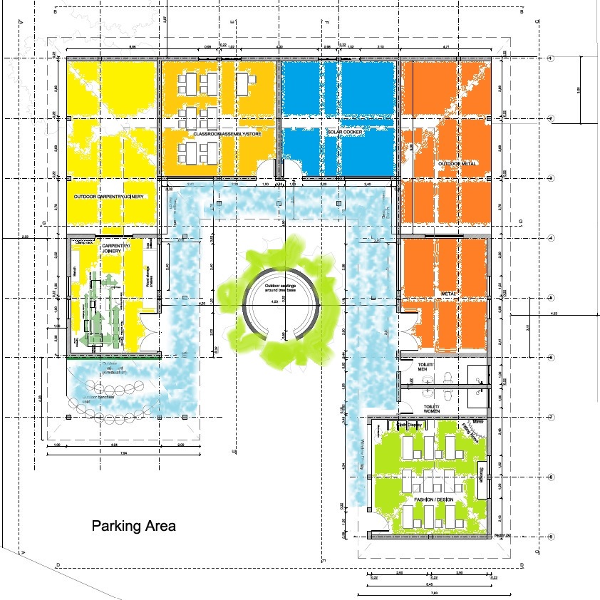 Fünf Werkstätten mit auch Außenbereichen bilden ein kleines Zentrum für handwerkliche Betätigung und Zusammenwirkung. Ein Baum steht in der Mitte und wächst dort als Zeichen des Fortschritts und der Verbundenheit. Unsere Werkstätten wurden von Rana Moumneh, MBL, BEng geplant.